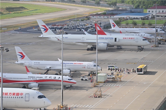 圖說:今日上午,東航接收的兩架C919客機在虹橋機場停機坪上,準備執(zhí)行滬蓉航線。圖/張弘歷