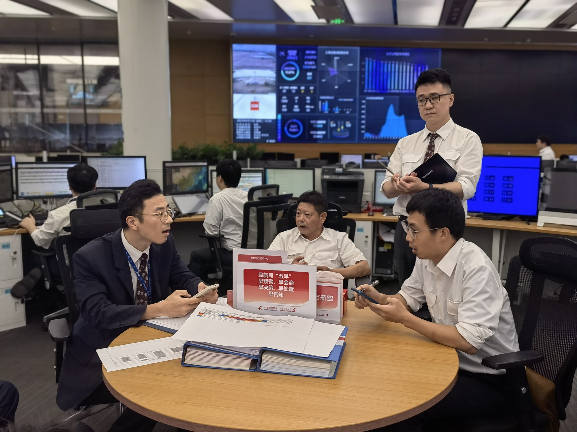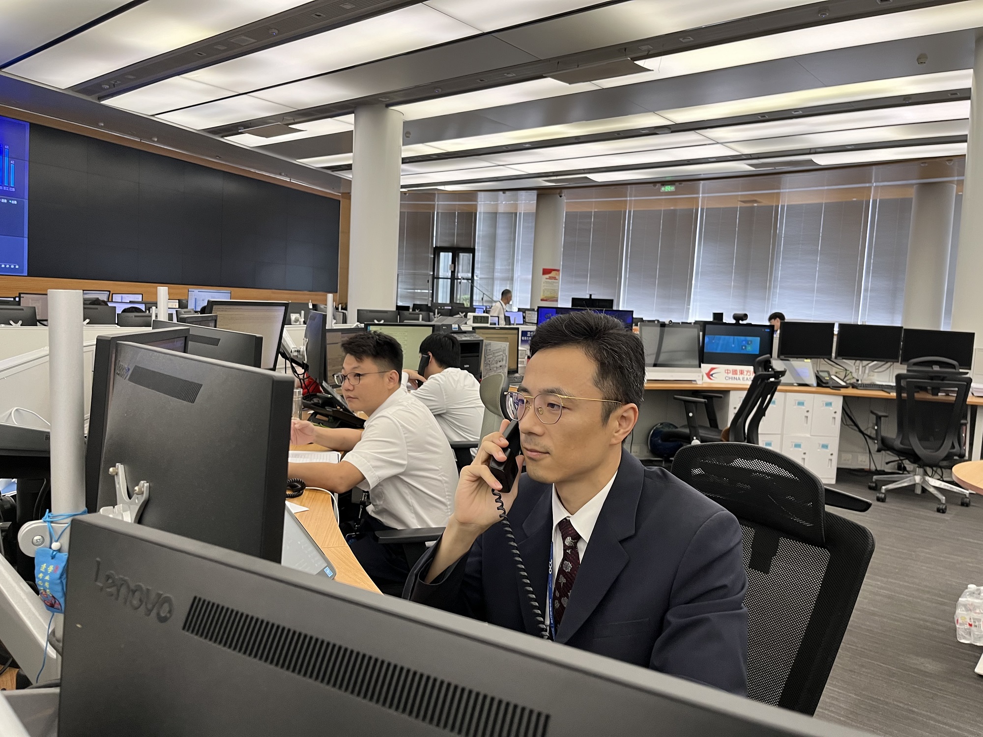 “喂,您好,這里是東航運行指揮中心(東指中心),請講……”在東航運行及客戶中心決策區(qū)的席位上,運行經理陳春益正一手接起電話,一手拿起筆在筆記本上唰唰地記錄著。電話那頭通報情況的語速很快,陳春益大腦飛速運轉,眉頭隨著筆尖的飛舞而漸漸緊鎖……而就在此刻,他旁邊的幾個座機又接二連三地響了,兩個助理小伙兒趕緊暫停各自手頭的工作,迅速接起了電話……