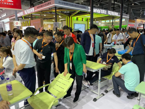 ▲領(lǐng)導(dǎo)、嘉賓和觀眾參觀了解午休課桌椅