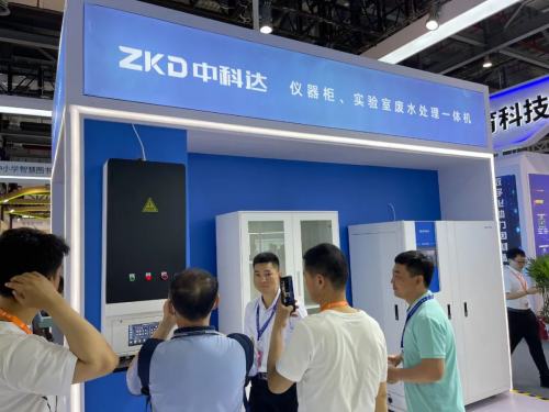 ▲領(lǐng)導(dǎo)、嘉賓和觀眾參觀了解實(shí)驗(yàn)室廢水處理一體機(jī)、儀器柜