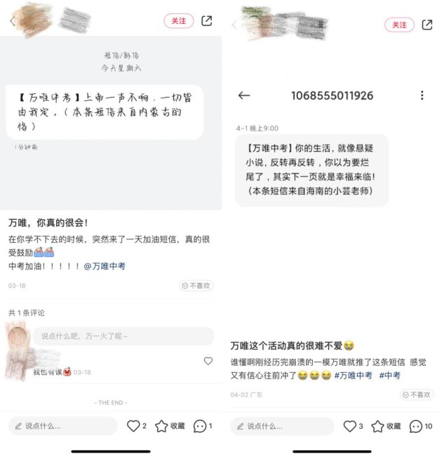 五年來,萬唯中考已為全國20多萬名學(xué)生發(fā)送超1000萬條暖心鼓勵(lì)短信,每年都被眾多師生點(diǎn)贊,來看看下面的神回復(fù)吧。