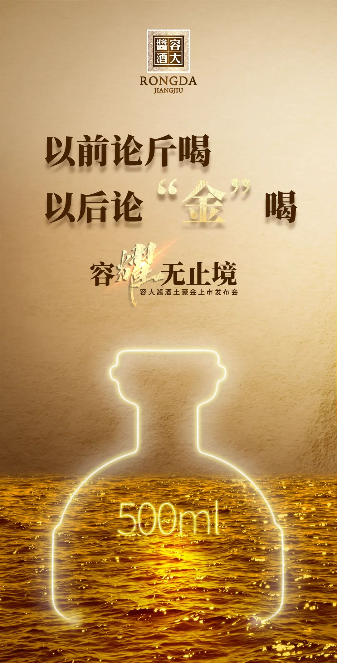 這是容大醬酒的手筆。4月下旬,容大醬酒戰(zhàn)略新品即將上市。樸實(shí)的宣傳語(yǔ),透露出其口糧醬酒的市場(chǎng)定位;奢華的土豪金顏色,又給人無(wú)限遐想,讓人對(duì)其品質(zhì)有了更多期待。