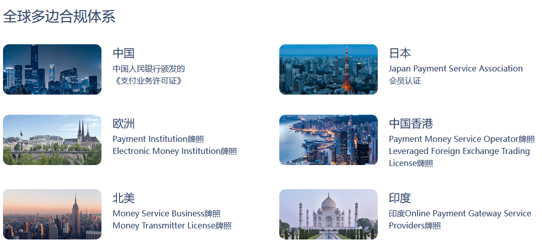 作為資金流服務(wù)的關(guān)鍵環(huán)節(jié),支付在多數(shù)國(guó)家都是重點(diǎn)監(jiān)管的項(xiàng)目。在跨境匯兌、資金分發(fā)等服務(wù)中,支付牌照作為展業(yè)的基礎(chǔ),是企業(yè)合規(guī)能力的直接體現(xiàn)。多年來(lái),PingPong福貿(mào)始終堅(jiān)持“牌照先行,資質(zhì)先行”理念,致力于在全球范圍內(nèi)多個(gè)主要經(jīng)濟(jì)體國(guó)家及地區(qū)爭(zhēng)取獲得合規(guī)牌照,以打造堅(jiān)實(shí)穩(wěn)固的全球多邊合規(guī)體系。目前已擁有中國(guó)、歐洲、美國(guó)、日本、印度、澳大利亞等主要經(jīng)濟(jì)體的數(shù)十張支付類(lèi)牌照及認(rèn)證資質(zhì),是國(guó)內(nèi)少有的雙邊持牌支付企業(yè)。