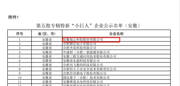 7月21日,工業(yè)和信息化部開展的第五批專精特新“小巨人”企業(yè)公示結(jié)束。安徽淘云科技股份有限公司(后稱“淘云科技”)憑借企業(yè)在專業(yè)、精細(xì)、特色、創(chuàng)新等核心競(jìng)爭(zhēng)力領(lǐng)域的出眾表現(xiàn),從眾多參選企業(yè)中脫穎而出,成功獲得第五批國(guó)家級(jí)專精特新“小巨人”的認(rèn)定!