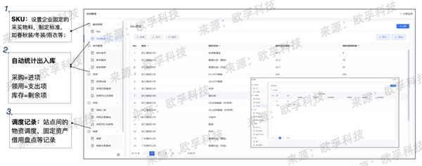 歐孚科技運用低代碼技術搭建了“物資進-出項“管理模塊。該模塊包括搭建SKU庫,對物資物料進行統(tǒng)一定義;配置采購調度的表單公式,使區(qū)域站點能根據實際領用情況進行填寫;根據各站點領用數據,快速統(tǒng)計物料成本并進行庫存盤點管理。