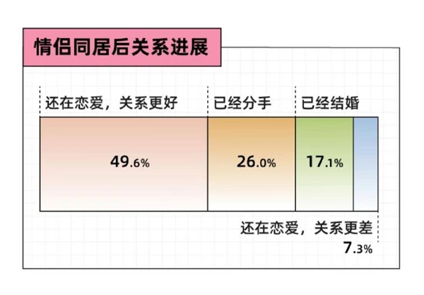 “同居分離會(huì)產(chǎn)生焦慮癥嗎”“試婚同居生子男方棄養(yǎng)”“同居該不該AA”……微博熱搜榜上,同居始終是一大熱門爭(zhēng)議話題。當(dāng)熱戀期的完美形象分崩離析,留給同居的年輕人的,是否只是一地雞毛?實(shí)際上,《報(bào)告》顯示,多數(shù)同居關(guān)系有著美好結(jié)局。