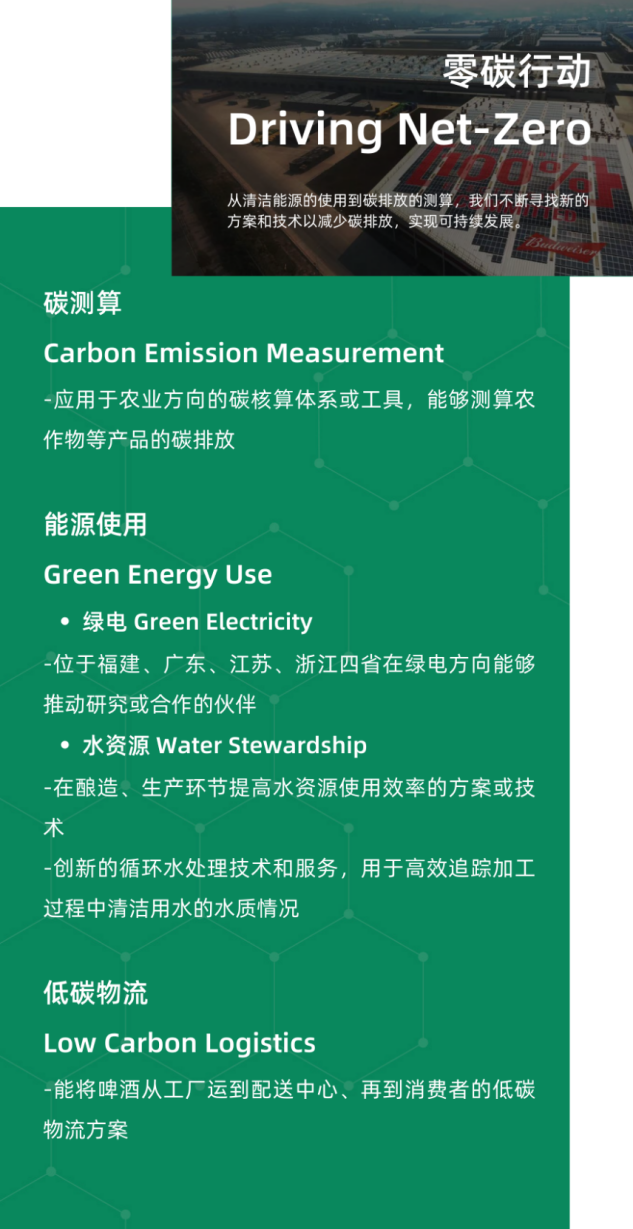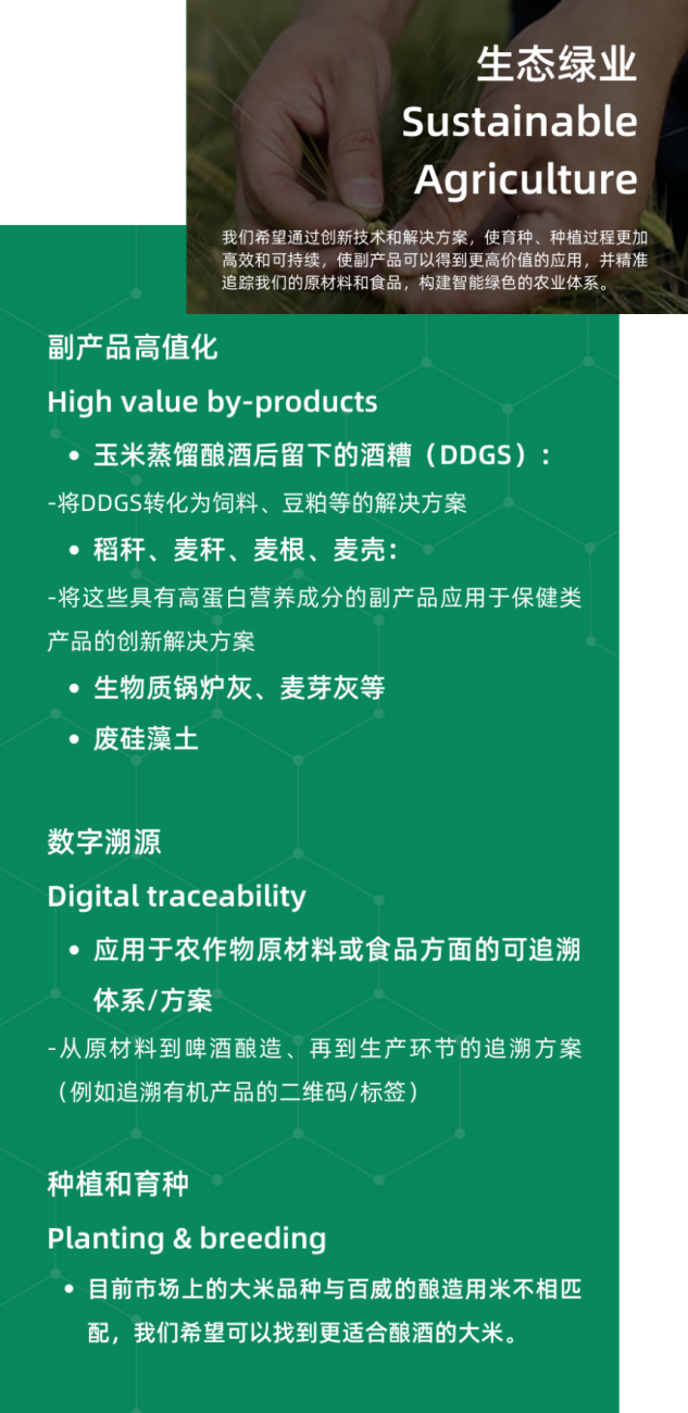 每一年,100+創(chuàng)新中心都會(huì)在價(jià)值鏈上梳理亟待解決的可持續(xù)發(fā)展挑戰(zhàn)議題并公開(kāi)招募創(chuàng)新解決方案,目標(biāo)是讓你的想法得到驗(yàn)證并實(shí)現(xiàn)商業(yè)化應(yīng)用,在試點(diǎn)完成后能夠獲得更大的商業(yè)合同,與百威中國(guó)以及更多伙伴建立強(qiáng)有力的合作。