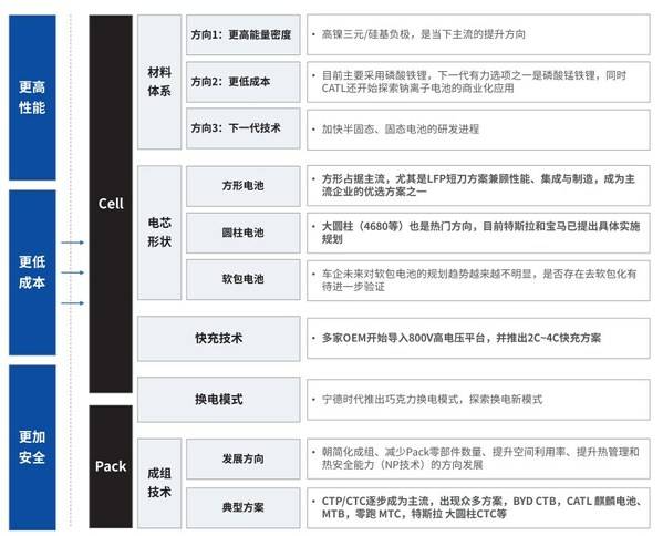 材料從根本上決定著電池性能。通過(guò)改進(jìn)材料提高電池性能、優(yōu)化電池老化機(jī)制、應(yīng)用新型材料、改變電芯結(jié)構(gòu)是電芯研發(fā)的主要方向。 例如,材料體系方面,采用新型材料體系(高鎳正極、硅基負(fù)極、鋰金屬負(fù)極、固態(tài)電解質(zhì)等),提高單體能量密度;或者研制出磷酸錳鐵鋰,探索鈉離子電池的商業(yè)化應(yīng)用,降低成本;或者加快固態(tài)電池的研發(fā)進(jìn)程,使電池性能更高,更耐久。電芯形狀方面,方形電池,尤其是LFP短刀兼顧性能、集成與制造,成為主流企業(yè)的優(yōu)選方案之一;大圓柱電池也是熱門方向,特斯拉和寶馬均已提出具體的實(shí)施規(guī)劃??斐浼夹g(shù)方面,多家主機(jī)廠開(kāi)始導(dǎo)入800V高電壓平臺(tái),并聯(lián)合電池企業(yè)推出2C~4C快充方案。