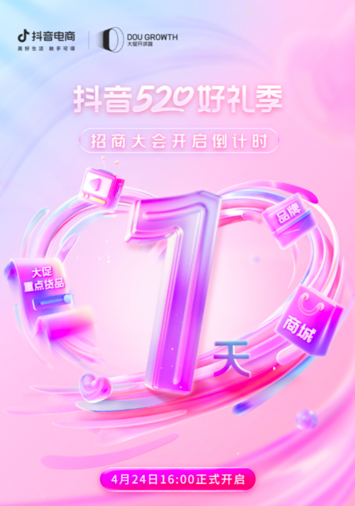 為給商家提前蓄勢520,擴寬商家經(jīng)營生意場,「抖音520好禮季」招商大會將于4月24日16點正式召開,屆時將為商家披露全域億級流量扶持權(quán)益,詳細(xì)解讀貨架與內(nèi)容場景參與方法,助推商家借助營銷節(jié)點,實現(xiàn)全域生意爆發(fā)。