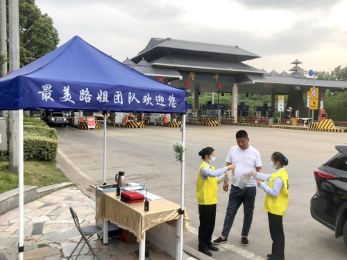 收費廣場的便民服務(wù)臺前,桌子上擺滿了高速地圖、住宿推薦、旅游攻略等各式各樣的宣傳手冊,緊急醫(yī)藥箱、簡易維修工具等一應(yīng)俱全?!澳銈兪召M站附近有修車的嗎?我的車半路出了點問題,現(xiàn)在得趕緊找個修車的地方?!币晃粍傁碌赖呢涇囁緳C搖下車窗,焦急地詢問道?!澳葎e著急,右邊大概100米左右就有一家汽修店,不遠的。天熱了給您拿瓶水喝,解解渴?!敝驹刚咭贿吇貞?yīng)著,一邊為司機送上了礦泉水?!艾F(xiàn)在出發(fā)去武漢的話,路上堵車嗎?”帶著一家人準備回家的王師傅咨詢道?!澳梢躁P(guān)注‘湖北e出行’微信公眾號,上面有實時路況信息,以后開車的時候都用得上?!睋乃緳C操作不熟練,志愿者還手把手地進行了演示?!澳銈冞@有地圖嗎?”“有開水嗎?”“有沒有多余的口罩啊?”……一張張燦爛的笑臉,一次次悉心的解答,志愿者們用真誠和真心,化作了高速路口最靚麗的風景。