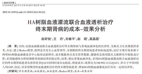8月1日,國家衛(wèi)生健康委衛(wèi)生發(fā)展研究中心、國家藥物與衛(wèi)生技術綜合評估中心趙琨研究員等的研究成果《HA樹脂血液灌流聯(lián)合血液透析治療終末期腎病的成本-效果分析》發(fā)表于《衛(wèi)生經(jīng)濟研究》雜志。