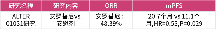 ALTER 01031的Ⅱ期隨機(jī)對照研究的結(jié)果表明,對比安慰劑,安羅替尼組的客觀緩解率(ORR)達(dá)到48.39%,可以顯著延長中位無進(jìn)展生存期(mPFS)達(dá)9.6個(gè)月(20.7個(gè)月 vs. 11.1個(gè)月)[8],為晚期MTC患者帶來顯著的PFS及ORR獲益,并且安全性良好。安羅替尼甲狀腺髓樣癌適應(yīng)癥的獲批,打破了國內(nèi)甲狀腺髓樣癌無靶向藥可用的局面,給患者帶來新希望。
