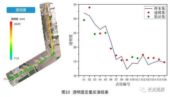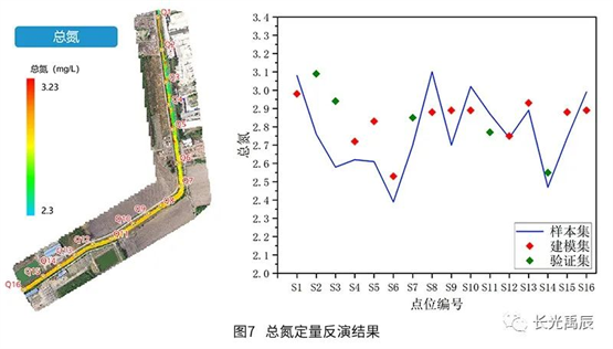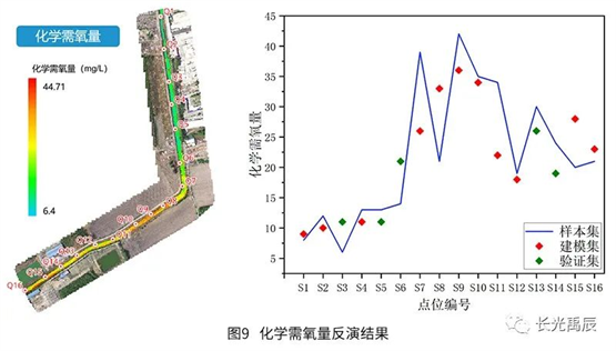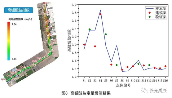 精度評定結(jié)果見表2.各水質(zhì)參數(shù)的平均相對誤差均在25%以下,可滿足常態(tài)化、高頻次的全局水質(zhì)檢測需求?;瘜W(xué)需氧量反演誤差稍大是因?yàn)樵摋l河道整體水質(zhì)情況存在較大的空間異質(zhì)性,河道不同河段中有機(jī)物含量差異較大,而水體化學(xué)需氧量與有機(jī)物濃度密切相關(guān),所以這種變化較快的梯度可能會(huì)引入一定的誤差,模型也有繼續(xù)優(yōu)化的空間。
