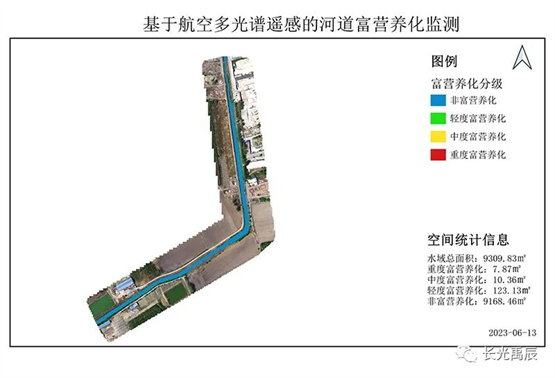 由上圖可以看出,該河道不存在富營養(yǎng)化現(xiàn)象,這與地面實(shí)測參數(shù)和現(xiàn)場感官情況保持一致,無人機(jī)多光譜遙感進(jìn)行水體富營養(yǎng)化識(shí)別精度較高。