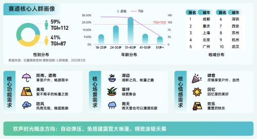 帳篷賽道解讀:該賽道抖音2022年搜索量同比增長(zhǎng)228.6%,遠(yuǎn)高于行業(yè)整體水平。該賽道的興趣群體以 31-40 歲的男性為主,主要分布地區(qū)涵蓋多個(gè)熱門(mén)旅游城市。隨著生活水平的提高和對(duì)自然休閑需求的增加,多功能帳篷在未來(lái)將更受歡迎,防雨、美觀和防風(fēng)等多重特性將滿(mǎn)足人們對(duì)于舒適和便利的需求。除此之外,在技術(shù)創(chuàng)新、多樣化產(chǎn)品、個(gè)性化定制、環(huán)保可持續(xù)發(fā)展等趨勢(shì)上,這一領(lǐng)域?qū)⒂袕V闊的市場(chǎng)前景。