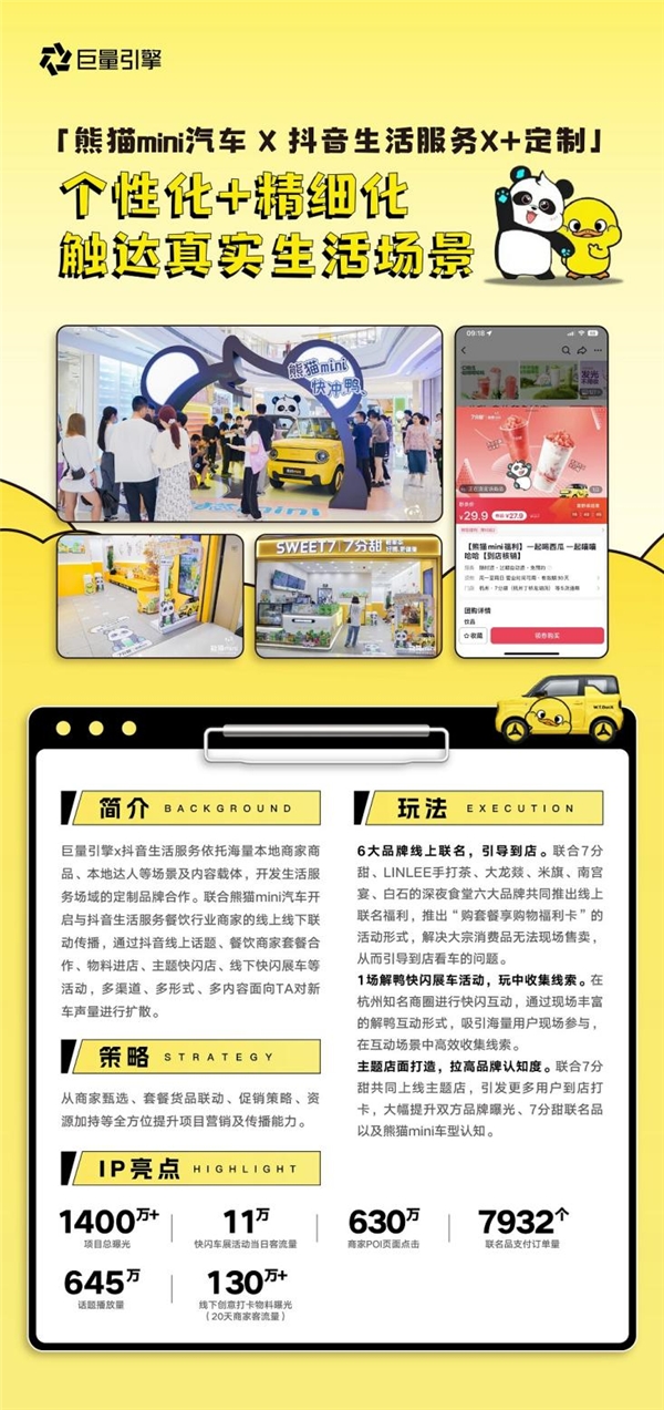 針對線索獲取成本高、轉化鏈路長等痛點,抖音生活服務聯(lián)手熊貓mini,攜手七分甜、LINLEE手打茶等六大品牌打造聯(lián)名福利,并在核銷等生活場景中植入新車,既擴散新車聲量,又高效收集高意向線索。