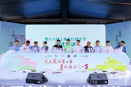 最后,奉賢區(qū)委、新民晚報、東方廣播中心、東方網(wǎng)、區(qū)融媒體中心、區(qū)文旅局、區(qū)農(nóng)委、莊行鎮(zhèn)及上海貴酒的領(lǐng)導共同開啟注水儀式,手持水瓶緩緩澆在寫有“第十六屆上海莊行伏羊節(jié)正式啟動”字的模具里,將開幕式的儀式感徹底拉滿。