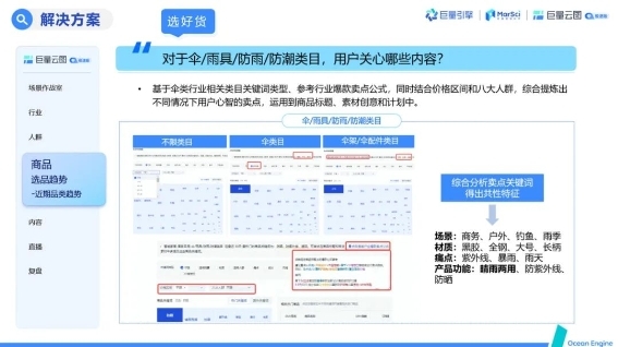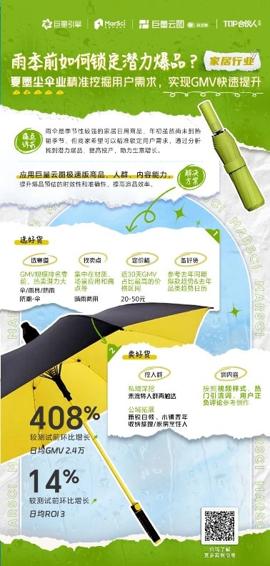 作為家居百貨行業(yè)代表,雨傘品類季節(jié)性更強(qiáng),上述問題也更為凸顯,年初雖然尚未到雨季熱銷節(jié)點(diǎn),但工廠希望可以精準(zhǔn)鎖定用戶需求,提前儲(chǔ)備新的爆品,未雨綢繆。如何準(zhǔn)確選出潛力爆品,并篩選精準(zhǔn)人群提高投產(chǎn),助力生意增長?