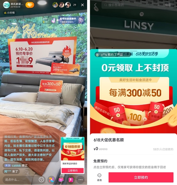 為此,在大促期間,林氏家居特意通過凸顯活動(dòng)優(yōu)惠的多種物料增加直播間大促氛圍 ,利用一目了然的優(yōu)惠信息吸引用戶駐足,借助包括商品介紹、稀缺性優(yōu)惠劵推介等標(biāo)準(zhǔn)化、模塊化的直播話術(shù),強(qiáng)調(diào)活動(dòng)優(yōu)惠信息,加速產(chǎn)品種草,引導(dǎo)用戶領(lǐng)取優(yōu)惠進(jìn)行留資,線下到店購買商品。