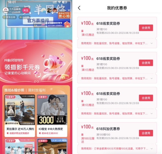 今年618,巨量引擎專門策劃了攝影行業(yè)分會(huì)場活動(dòng),從6月1日至6月24日,為報(bào)名的活動(dòng)商家提供活動(dòng)頁流量曝光、達(dá)人打call、直播間AD投流和DOU+獎(jiǎng)勵(lì) 。
