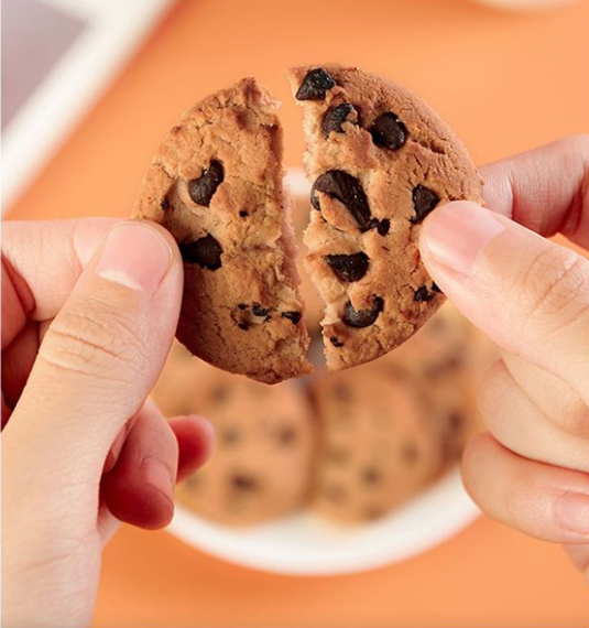 撕開獨立小包裝,就可以聞到濃郁的巧克力香氣,每一份里面兩塊餅干,每塊曲奇上面豆鑲嵌著滿滿巧克力豆。咬的時候可得注意,因為這個曲奇蘇到掉渣!一個不小心曲奇碎就會灑下來。細細咀嚼,酥脆的巧克力味曲奇和香醇的巧克力豆在口腔中碰撞出柔滑、醇香的火花,雙重口感翻倍美味!