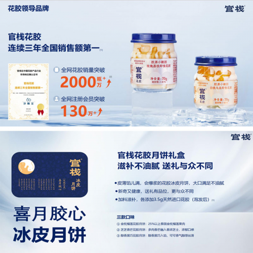 官棧極其重視此次展會,不僅帶來6大主力產品線,包括鮮燉花膠、即食花膠、輕食花膠、花膠料理、干花膠和季節(jié)限定禮盒;還帶來兩款重磅新品:港式花膠羹,以及首次對外展示的《溏心風暴之家好月圓》IP聯(lián)名款花膠流心月餅禮盒,從而帶給采購商更多選擇。