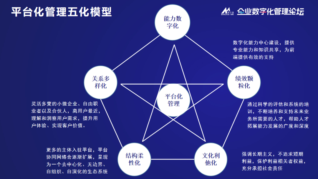 5. 文化利他化:公司文化要強調(diào)堅持長期主義,不能追求短期的利益,以保護利益相關者的權益而充分地承擔社會責任。平臺化管理的文化是內(nèi)化于心,尤其是外部合伙人要幫助他。