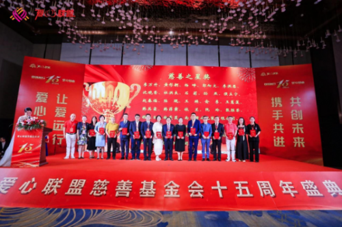 下午,愛心聯(lián)盟慈善基金會(huì)成立十五周年盛典隆重舉行。全國(guó)勞動(dòng)模范、全國(guó)五一勞動(dòng)獎(jiǎng)?wù)芦@得者、全國(guó)道德模范、吉林省工商聯(lián)副主席、吉林省河南商會(huì)會(huì)長(zhǎng)、愛心聯(lián)盟慈善基金會(huì)理事長(zhǎng)李萬(wàn)升,河南省政府駐上海辦副主任胡華杰,哈爾濱市政府駐上海辦經(jīng)協(xié)處處長(zhǎng)田磊,中國(guó)浦東干部學(xué)院黨建研究中心主任吳濤,上海中信國(guó)旅總經(jīng)理羅良剛,山東馳恒投資發(fā)展有限公司董事長(zhǎng)王久紅,昆山物流協(xié)會(huì)會(huì)長(zhǎng)孫喜,來伊份股份有限公司高級(jí)副總裁趙漢利,新希望集團(tuán)草根資本投資部部長(zhǎng)許云龍,上海歐邦醫(yī)療管理有限公司創(chuàng)始人崔海茹,眼界(上海)健康管理有限公司創(chuàng)始人謝攖寧,浙江省有機(jī)產(chǎn)業(yè)協(xié)會(huì)理事長(zhǎng)胡珊,上海妃魚股份高級(jí)副總裁李財(cái)鋒,愛心聯(lián)盟慈善基金會(huì)執(zhí)行理事長(zhǎng)楊崢,以及上海市工商聯(lián)直屬商會(huì)和各省市在滬異地商會(huì)秘書長(zhǎng)等來自全國(guó)各地的精英和愛心聯(lián)盟成員300余人歡聚一堂,共同慶祝愛心聯(lián)盟慈善基金會(huì)成立十五周年。