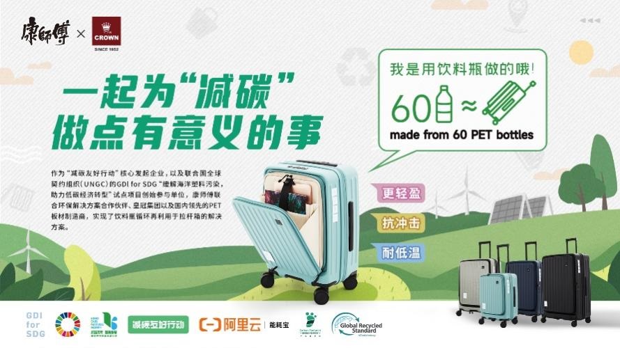 康師傅還作為主要發(fā)起單位之一攜手聯(lián)合國全球契約組織(UNGC)共同發(fā)起了GDI for SDG(全球發(fā)展倡議助力可持續(xù)發(fā)展目標)的首個試點項目——“緩解海洋塑料污染,助力低碳經(jīng)濟轉(zhuǎn)型”,與合作伙伴一道將回收的PET等使用后塑料制品,再造為多種生活消費品,又通過電商平臺的銷售推廣,實現(xiàn)循環(huán)利用。在前不久的世界地球日,康師傅與環(huán)保解決方案合作伙伴共創(chuàng),實現(xiàn)了用康師傅廢棄飲料瓶制作拉桿箱、野餐墊、收納盒等環(huán)保周邊產(chǎn)品。其中聯(lián)合旅行箱品牌CROWN皇冠,共同推出環(huán)保旅行箱,也是在電商很受追捧,成為第一個商業(yè)化的rPET項目。由于應(yīng)用了專利技術(shù),旅行箱使用的回收塑料量大,比現(xiàn)有材料更環(huán)保,而且品質(zhì)更好,無異味,更耐沖擊,耐低溫。這個項目實現(xiàn)了從塑料循環(huán)利用到商業(yè)價值鏈的良性循環(huán),讓業(yè)界看到循環(huán)經(jīng)濟模式的曙光。