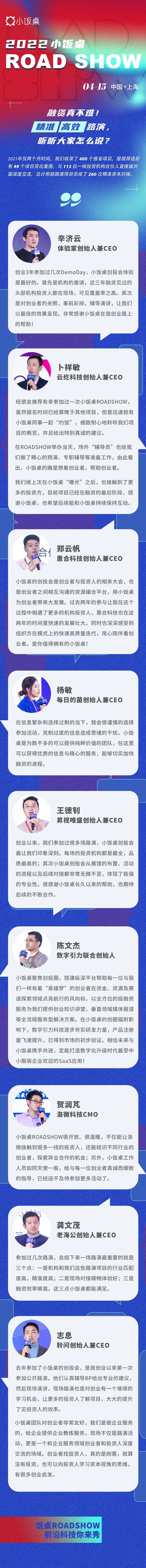 導語:4月15日,2022小飯桌ROASHOW將登陸上海,將開設“新能源與新材料”、“企業(yè)服務與工業(yè)科技”、“生物技術與醫(yī)療健康”賽道專場路演,歡迎各位優(yōu)秀的科技創(chuàng)業(yè)者前來應戰(zhàn)!