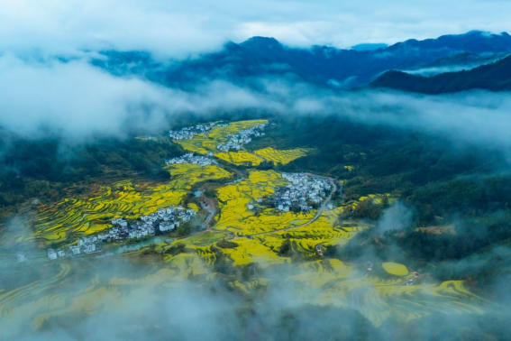 清風(fēng)吹拂金波涌,飄溢醉人濃郁香,在“中國(guó)四大花?!敝坏慕瓗X梯田,漫山遍野的油菜花隨著梯田彎曲的線條蜿蜒至遠(yuǎn)方,猶如金蛇舞動(dòng)。煙雨中的江嶺,空氣中飄散著清新的泥土氣息和油菜花的清香,置身江嶺梯田,遠(yuǎn)遠(yuǎn)望著民居與花海仿若仙,朦朧夢(mèng)幻。——這正是在婺源江嶺這幅水墨江南畫(huà)里,讓我們無(wú)比渴求的,仿佛從畫(huà)中來(lái),帶著水墨香。