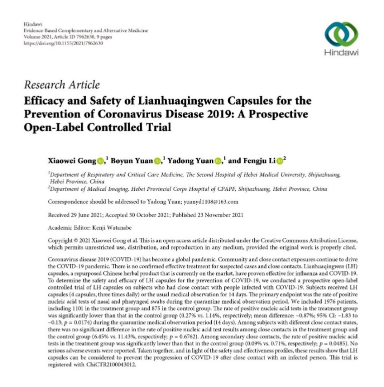 連花清瘟膠囊/顆粒預(yù)防新冠肺炎的作用得到了臨床研究的證實(shí)。前不久,由河北醫(yī)科大學(xué)第二醫(yī)院呼吸與危重癥醫(yī)學(xué)二科主任袁雅冬教授主持開展的“連花清瘟膠囊預(yù)防新型冠狀病毒肺炎”真實(shí)世界研究論文被國際權(quán)威期刊《循證補(bǔ)充和替代醫(yī)學(xué)》刊發(fā)。該論文指出,連花清瘟膠囊在有效治療流感、新冠肺炎COVID-19的同時,兼具預(yù)防新冠肺炎的作用,為新冠疑似病例和密切接觸者提供了新的治療方案。