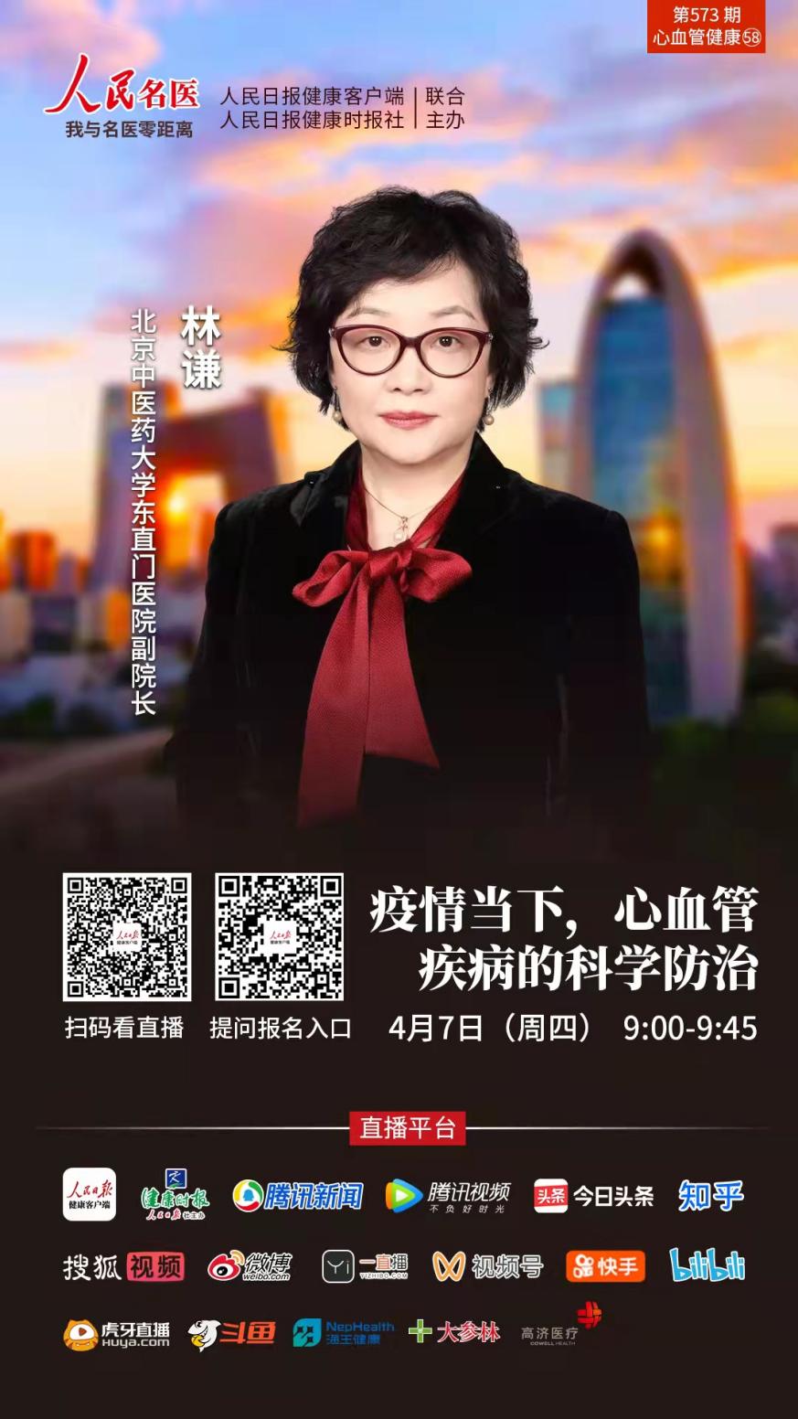 4月7日上午9:00~9:45,以嶺藥業(yè)聯(lián)合人民日?qǐng)?bào)健康客戶(hù)端策劃的世界健康日直播訪談節(jié)目《疫情當(dāng)下,心腦血管疾病的科學(xué)防治》,特別邀請(qǐng)到北京中醫(yī)藥大學(xué)東直門(mén)醫(yī)院副院長(zhǎng)林謙為大家進(jìn)行權(quán)威解答!