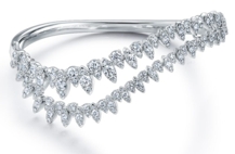 這款簡(jiǎn)約的手鐲以富有彈性的18K金打造而成,兩行優(yōu)雅排列的鉆石交匯于中央,