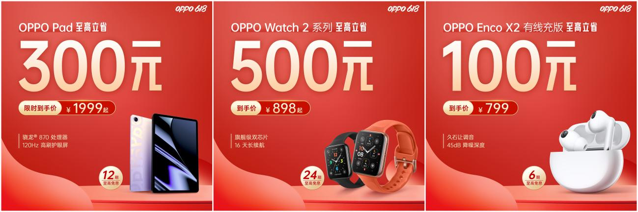 對(duì)于想要組建OPPO全家桶的用戶來(lái)說(shuō),此次OPPO 618活動(dòng)入手IoT產(chǎn)品也是不錯(cuò)的選擇。其中OPPO Pad至高立省200元,到手價(jià)僅需1999元起;長(zhǎng)續(xù)航雙芯智能手表OPPO Watch 2系列至高立省500,到手價(jià)僅為898元起;旗艦級(jí)無(wú)線降噪耳機(jī)OPPO Enco X2有線充版也享有799元的到手價(jià)福利。