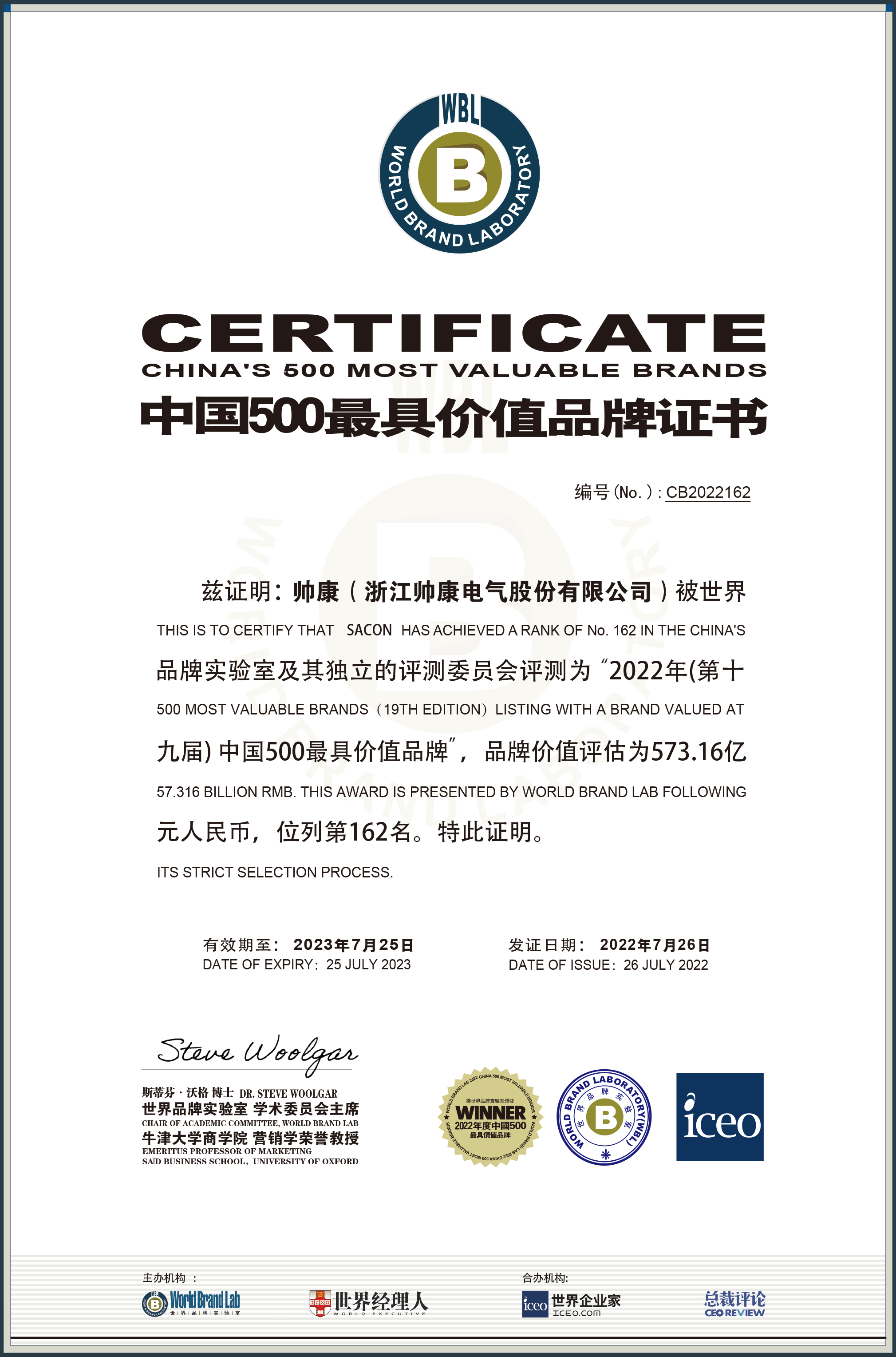 2022年(第十九屆)中國500最具價(jià)值品牌?證書
