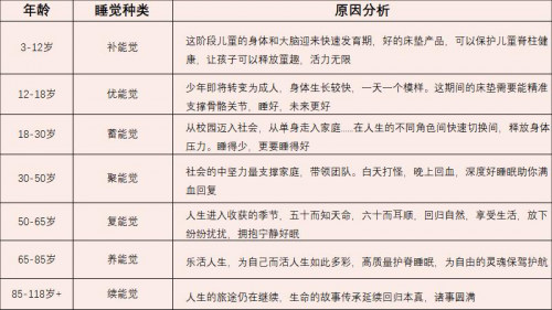 據(jù)了解,這8種覺囊括從新生到暮年的8個階段,每個階段根據(jù)人的身體發(fā)育需求、身體特征,結(jié)合所處年齡階段、社會環(huán)境等因素,來選擇不同的床墊,進(jìn)而滿足人在每個階段好好睡覺的需求。