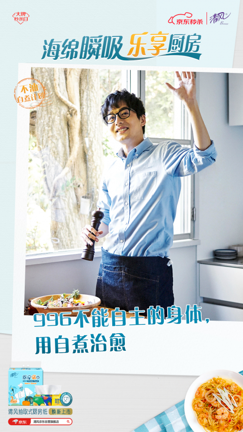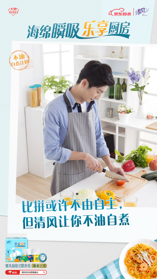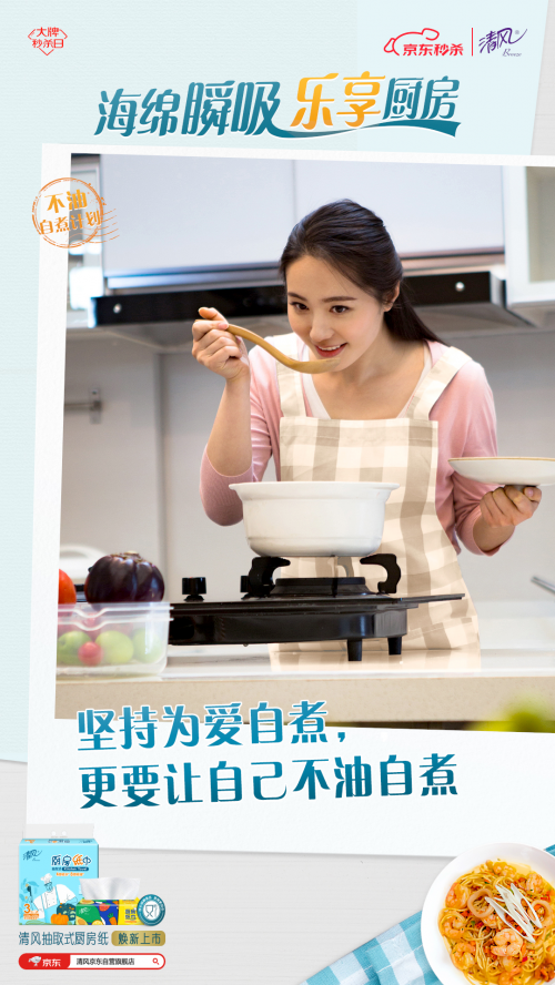 為此,清風(fēng)推出“不油自煮計(jì)劃”, 以煥新上市的清風(fēng)海綿吸廚房紙巾為依托,用“一抹即凈”的不油體驗(yàn)和“一掃就會(huì)”的自煮攻略,幫助用戶破除廚房恐懼,給不同身份的用戶輕松自煮不油膩的廚房體驗(yàn),讓TA們能不由自主地愛(ài)上烹飪,輕松享受做飯帶來(lái)的快樂(lè)。
