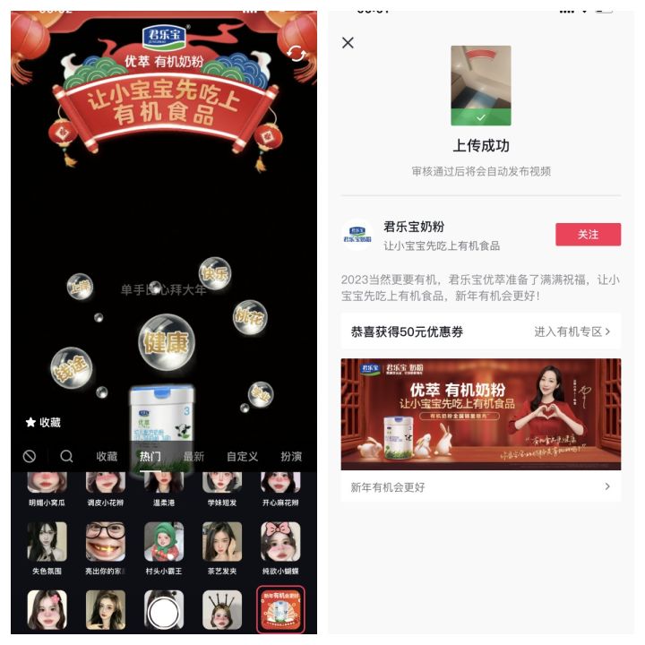 除了用戶喜聞樂見的直播欄目流量加持之外,優(yōu)萃有機奶粉還充分借勢品牌卡券植入從攻占用戶心智到構(gòu)建雙方鏈接。如在放煙花、猜燈謎、拍新年視頻等創(chuàng)意互動中,使得優(yōu)萃有機奶粉的品牌信息在活動頁面多次露出,讓用戶潛移默化對品牌產(chǎn)生認同與共鳴,無形中為品牌帶去巨大的人群增量和品牌曝光量。與此同時,用戶心智強種草對品牌后續(xù)的銷售也起到了關(guān)鍵的推動作用,對此優(yōu)萃有機奶粉直擊落地銷售轉(zhuǎn)化,以大幅優(yōu)惠更高效地激發(fā)用戶購買欲,例如通過游戲獎勵的形式發(fā)放品牌優(yōu)惠券,并引導(dǎo)用戶進入有機專區(qū),直接帶動優(yōu)萃有機奶粉的生意轉(zhuǎn)化。