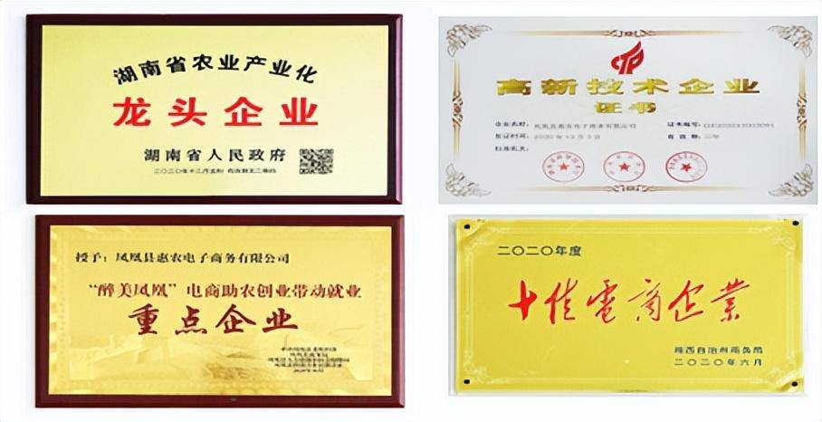 2020 年, 公司獲得湖南省農(nóng)業(yè)龍頭企業(yè) 、湖南省電子商務(wù)企業(yè)、湖南省高新技術(shù)企業(yè)、鳳凰縣電商消費扶貧新技術(shù)企業(yè)、鳳凰縣電商消費扶貧示范企業(yè)、鳳凰縣電商助農(nóng)就業(yè)帶動重點企業(yè)、湘西州十佳電商企業(yè)等榮譽稱號。