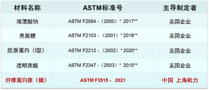 ASTM International自2000年以來,共批準發(fā)布了5個天然高分子材料的ASTM標準,前4個均形成了龐大的產(chǎn)業(yè),且均為美國企業(yè)主導(dǎo)制訂。第5個為中國生物科技領(lǐng)軍企業(yè)-上海松力主導(dǎo)制訂