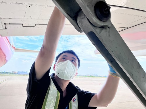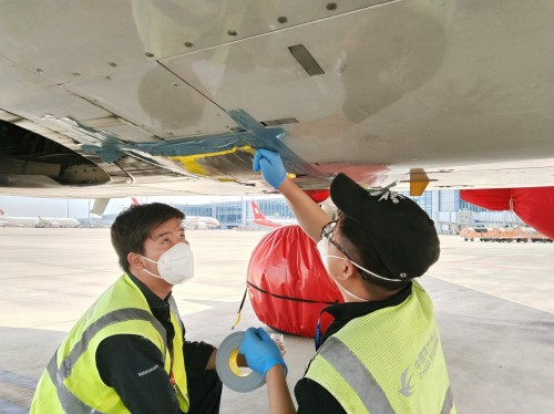 由于溫度較高,機(jī)務(wù)人員細(xì)心地檢查封存膠帶的粘性,避免由于高溫軟化或脫膠,以及對飛機(jī)表面產(chǎn)生腐蝕。雖然在機(jī)腹陰涼處,兩位機(jī)務(wù)小伙還是感覺層層熱浪
