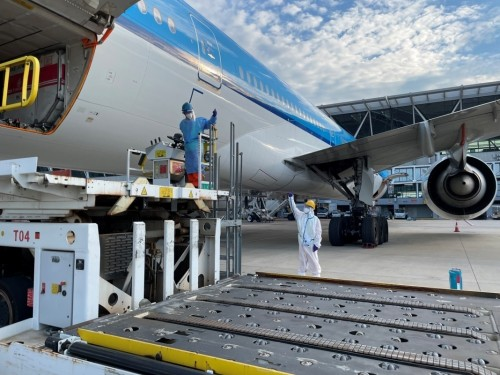 擦拭飛機(jī)起落架鏡面是航線保障中很尋常的一項工作,但由于今天外部氣溫較高,吸油棉接觸飛機(jī)鏡面后,東航機(jī)務(wù)員工的手心瞬間感覺炙熱