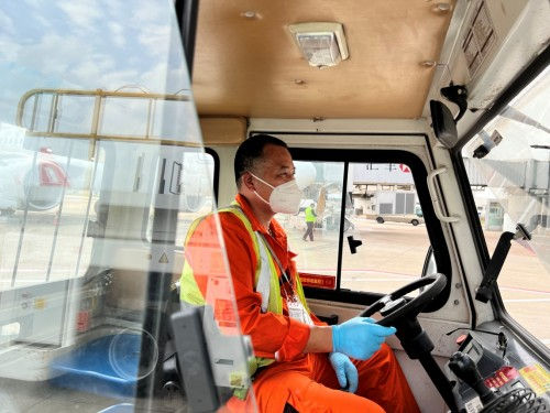 MU6328航班到達(dá)行李運送中,開窗通風(fēng)才能讓小小的行李牽引車車內(nèi)溫度降低點。