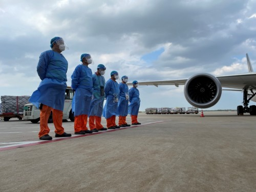 烈日下,東航地面裝卸員正在列隊等待航班到來,一陣陣熱浪撲面而來。