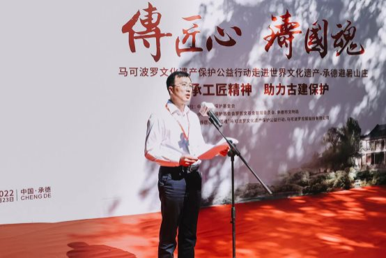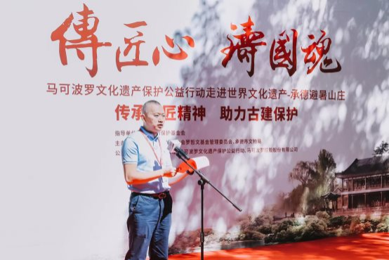簽約儀式現(xiàn)場,承德市副市長張樹國對公益行動的落地以及馬可波羅控股公益捐贈表達(dá)了衷心地感謝。他表示,“傳匠心·鑄國魂”馬可波羅文化遺產(chǎn)保護(hù)公益行動捐贈儀式暨開工典禮在避暑山莊舉行,既是對承德文化遺產(chǎn)保護(hù)傳承工作的高度認(rèn)可和鼓勵,又是政府、基金組織、企業(yè)共同落實總書記對文化遺產(chǎn)保護(hù)工作重要指示精神的具體實踐,具有重大而非凡的意義。承德市將以此為契機(jī),進(jìn)一步增強(qiáng)全社會對文化遺產(chǎn)的保護(hù)意識,做好各項文化遺產(chǎn)保護(hù)工作,構(gòu)建起政府主導(dǎo)、全社會共同參與的文化遺產(chǎn)保護(hù)新格局,為弘揚(yáng)中華優(yōu)秀傳統(tǒng)文化、推動文物保護(hù)事業(yè)貢獻(xiàn)承德力量。