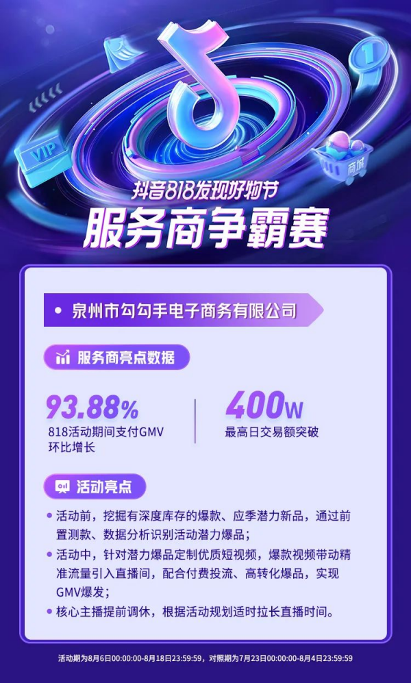 用足全營銷鏈路,他們讓商家在818更具聲量。泉州市勾勾手電子商務(wù)有限公司與其服務(wù)的貴人鳥童裝旗艦店緊密配合,在818活動(dòng)前,提前測款,挖掘有深度庫存的爆款、應(yīng)季潛力新品;活動(dòng)中,針對潛力爆品定制優(yōu)質(zhì)短視頻,帶動(dòng)精準(zhǔn)流量引入直播間,配合付費(fèi)投流、高轉(zhuǎn)化爆品,實(shí)現(xiàn)GMV爆發(fā),GMV環(huán)比上月增長93.88%。
