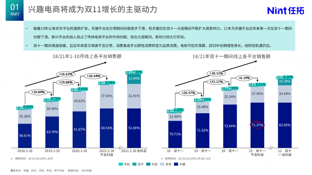 興趣電商將成為雙11增長的主驅(qū)動力 回顧2018年-2021年雙11全域電商增長趨勢可見,2018年-2021年全域電商雙11銷售增長逐步放緩,2021年,不含抖音銷售規(guī)模,僅維持個位數(shù)增長。