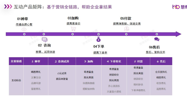 同時(shí),慧博「雪鸮」的互動(dòng)營(yíng)銷產(chǎn)品是基于用戶營(yíng)銷全鏈路,從種草、咨詢、加購(gòu)、下單、付款、售后整個(gè)閉環(huán)流程,最大程度的完成用戶價(jià)值轉(zhuǎn)化,提升用戶忠誠(chéng)度。