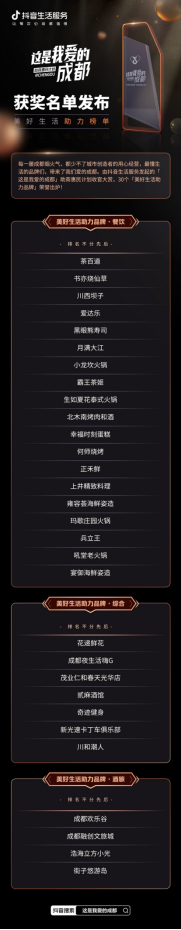 2022年11月4日,由抖音生活服務(wù)發(fā)起的「這是我愛的成都」助商惠民計劃收官大賞,以一場「這是我愛的成都·美好生活助力榜單」榮譽發(fā)布,對活動期間為成都播撒生活美好的30個品牌和10位達人做出總結(jié)與嘉獎。